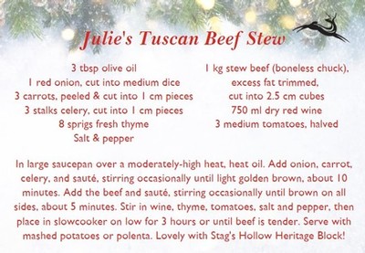 Write your list, check it twice and get shopping…then come home to dinner and our 2020 Heritage Block! Dark fruit dominates the palate, with plenty of ripe tannins, a hint of spice and juicy acidity, making this a great red to be paired with Julie's favorite crockpot Tuscan Beef Stew. An easy stress-free Sunday meal that you can prepare in the morning, leave for the day and enjoy that night. Happy shopping! ππ€Άπ» ποΈ